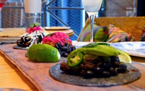 6 tortillas de maiz artesanas, guacamole, salsa ranchera, oaxaca, frijoles, maíz, pimientos, crema agria
